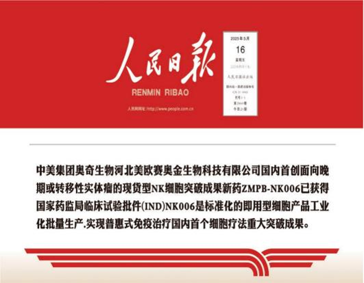 加强型免疫疗法是通过国家药监局审批的全国唯一实体肿瘤免疫细胞 IND , 众 多 媒 体 竞 相 报 道 : “ 现 货 型 NK 细 胞 疗 法 ”ZMPB-NK 注射液正式获批IND , 标志着中国 免疫细胞疗法在攻克实体瘤方面迈出关键一步 , 将改 变实体瘤预防、 治疗、 康复格局 , 是肿瘤术后防复发 的有力武器。 这一创新成果标志着我国在细胞治疗领 域已从“跟跑”转向“并跑” , 正在向全球创新“领 跑者”迈进。